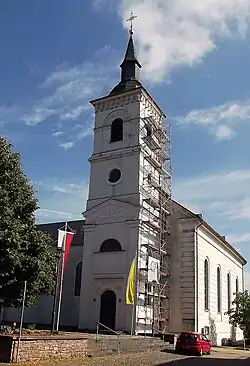 Da die im Jahr 1734 errichtete Kapelle nicht mehr den Erfordernissen der wachsenden Pfarrgemeinde entsprach, entschloss man sich eine neue Gottesdienststätte zu bauen.[2] Dies geschah in den Jahren 1830 bis 1831.[2][3] Die Pläne der neuen Pfarrkirche, die wieder dem heiligen Nikolaus gewidmet wurde und den heiligen Hubertus als zweiten Patron erhielt, stammten von Baumeister Peter Bentz (Trier).[3]