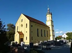 Der älteste Baubestandteil der Kirche ist der Kirchturm aus der zweiten Hälfte des 17. Jahrhunderts. Der restliche Bau ist ein Neubau nach den Plänen von Peter Klein, ausgeführt ab dem Jahr 1871 durch Stephan Stark. Im Jahr 1876 fand die Weihe der Kirche statt. Die Kirche ist ein neuromanischer Saal mit Flachdecke. An das Langhaus schließt sich der eingezogene fünfseitig geschlossene Chor an. Im Chor befindet sich ein Kreuzgratgewölbe. An der Südseite befindet sich der Kirchturm. Dieser ist im unteren Bereich quadratisch, worauf sich ein achteckiger Aufsatz anschließt. Abgeschlossen ist er mit einer neubarocken Kuppelhaube von 1898 mit Laterne. Die Innenausstattung der Kirche stammt aus der Erbauungszeit der Kirche. Thomas Guggenberger schuf 1873 die Fresken der Kirche.