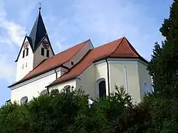 Die spätmittelalterliche Saalkirche wurde 1741/42 durch Johann Puchtler erweitert. Sie besteht aus dem Langhaus, dem eingezogenen, dreiseitig geschlossenen Chor im Osten, der Sakristei an der Südwand des Chors und dem Kirchturm im Westen, dessen untere Geschosse vom mittelalterlichen Vorgänger beibehalten wurden. Die Wände des Kirchturms schließen mit dreieckigen Giebeln ab, über denen sich der 1848 aufgesetzte spitze Helm erhebt. Oberhalb der Klangarkaden für das aus vier Glocken bestehende Geläut[1] sind die Zifferblätter der Turmuhr angebracht. Der Innenraum ist mit Flachdecken überspannt.
