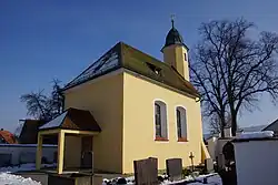 Die Saalkirche ist im Kern romanisch. Sie besteht aus einem Langhaus und einem quadratischen Chorturm im Osten, dessen Satteldach im 17. Jahrhundert ein achteckiger Dachreiter aufgesetzt wurde. Dieser beherbergt den Glockenstuhl, in dem zwei Kirchenglocken hängen.[1] Er ist mit einer Glockenhaube bedeckt.