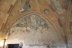 An der westlichen Wand sind zwei Szenen des Todes der Jungfrau Maria dargestellt: Im unteren Teil Maria auf der Bahre umgeben von den Zwölf Aposteln; darüber umgeben von einer Mandorla aus Wolken der Christkönig, in seinen Händen ein Zepter und die Seele der Jungfrau Maria.
