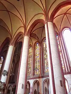 Im Innern tragen kräftige Rundpfeiler das Gewölbe. Jedes der annähernd quadratischen Joche der Seitenschiffe besitzt zwei Fensterachsen, so dass fünfteilige Gewölbe ähnlich wie in den Seitenschiffen des Magdeburger Doms entstehen. Der Chor wird von einem Lettner mit zwei Durchgängen abgetrennt, der nach Westen mit einem Ambo auf zwei Säulen und einem Gewölbe versehen ist. Auf der Nordseite schließt sich an das zweite Joch eine Vorhalle an, die mit einer Fensterrose und einem Staffelgiebel versehen ist. Diese Vorhalle wurde für den Zugang zum Langhaus erforderlich, da eine Marienkapelle an die Westwand der Turmfront angefügt worden war und somit der Zugang von Westen zum Langhaus nicht mehr zur Verfügung stand. Diese Kapelle wurde 1730 abgebrochen und ist nur im Dachansatz am Westbau zu erkennen.[2]