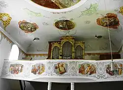 14 Deckenfresken von Vitus Greitman (auch: Greittmann/Greithmann) stellen Szenen aus dem Leben des Kirchenpatrons dar, das Hauptfresko im Langhaus, auf Treppenstufe signiert und datiert, 1753. Mehrere Sinnsprüche enthalten jeweils ein Chronogramm, das in der Summe der römischen Zahlzeichen das Jahr 1753 ergeben. Die Stuckierung in Malerei ist vorgetäuscht. Die geschnitzten Stuhlwangen aus dem frühen Rokoko wurden um 1740 geschaffen.[5]