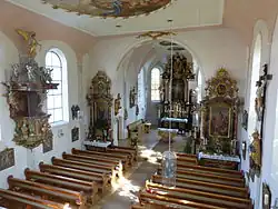 Der Tabernakel aus dem Jahr 1928 ist neubarock. Die am Tabernakel angebrachten Statuetten der Evangelisten sind aus der Zeit um 1720. Johann Kaspar schuf ebenfalls die Altarbilder der Seitenaltäre. Das Altarbild des linken Seitenaltares zeigt die Muttergottes. Im Auszug des linken Seitenaltares ist die Verkündigung dargestellt. Der heilige Nikolaus ist im rechten Altarbild dargestellt. Im Auszug darüber befindet sich die Darstellung des heiligen Ulrich.