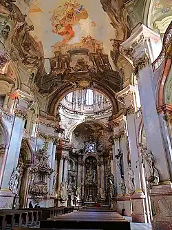 Das prachtvolle Interieur stellt einen Höhepunkt der barocken Kunst dar und sollte die Macht der katholischen Kirche versinnbildlichen. An seiner Ausstattung waren zahlreiche namhafte Künstler beteiligt. Das riesige Deckenfresko Verherrlichung des heiligen Nikolaus von Johann Lucas Kracker gehört mit seiner Ausdehnung von 1500 Quadratmeter zu den größten Gemälden Europas. Die Kuppel ist mit dem Fresko Die Heilige Dreifaltigkeit geschmückt, einem Werk von Franz Xaver Palko, darunter ragen Monumentalstatuen von vier Kirchenlehrern von Ignaz Franz Platzer in die Höhe.