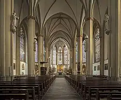 Etliche Fenster, insbesondere in den Seitenschiffen, wurden von dem Künstler Paul Weigmann geschaffen. Sie stammen teilweise aus dem Jahr 1978 und zeigen Ornamente aus Symbolen des Himmlischen Jerusalem (Zinnen, Türme, Tore) und Heilige und Gerechte (u. a. St. Liudger, St. Paulus, Maria Königin des Rosenkranzes, Adolf Kolping, Arnold Janssen, Clemens August von Galen, Maximilian Kolbe). Weitere Fenster wurden von Weigmann in den Jahren 1984–1985 gestaltet; sie zeigen biblische Szenen, wie z. B. die Krönung Mariens, die Hochzeit zu Kanaa, den Baum des Lebens. Im Maßwerk etlicher Fenster finden sich Fragmente der historischen Verglasung.