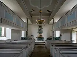 Den Innenraum überspannt eine Stuckdecke mit leichten Verzierungen und in den Ecken Malereien abwechselnd mit den Initialen von Franz Josias oder dem Rautenkranzwappen unter der Krone. Eine hölzerne Empore mit einfach vertäfelten Brüstungen und dorischen Säulen, zweigeschossig an den Längsseiten und eingeschossig an der Querseite, prägt den Raum. Der Kanzelaltar ist mit der Kanzel ein Schnitzwerk des Coburger Künstlers Johann Eusebius Kaufmann.[3]
