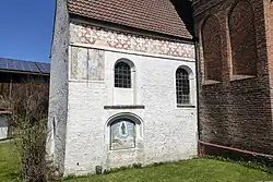 Der südseitig angebaute Chorflankenturm ist spätgotisch und dürfte daher zeitgleich mit dem Chor entstanden sein. Oberhalb zweier von gefasten Spitzbogenblenden verzierter Geschosse befindet sich der Glockenstuhl, der hinter doppelt gefasten, spitzbogigen Schallöffnungen zwei Glocken aus der Erbauungszeit der Kirche enthält. Diese müssen noch heute von Hand geläutet werden. Den oberen Abschluss bildet ein einfaches Satteldach. Der Turm ist der einzige unverputzte Gebäudeteil; hier ist das gotische Backsteinmauerwerk sichtbar, während Langhaus und Chor mit einer weißen Kalkschlämme überzogen sind. Eine Besonderheit ist die Schiefstellung des Turmes; er ist um rund 60 Zentimeter nach Süden geneigt. Im Turmuntergeschoss ist die Sakristei untergebracht; in rund drei Metern Höhe, also ein Geschoss oberhalb der Sakristei, befindet sich auf der Turmostseite eine Tür, über die eine Betretung der oberen Geschosse möglich ist.[1][3][4]