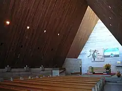 Das Innere der Kirche wird von zwei Materialien geprägt: Der Boden und die niedrigen Sockelwände bestehen aus Beton, das zeltförmige, hoch aufragende Dach der Kirche wurde mit Lärchenholz verkleidet. Die Fenster der Kirche sind so in den Baukörper eingefügt, dass der Gläubige diese zunächst nicht wahrnimmt. Sie erhellen die Kirche mit indirektem Licht. Die Fenster sind in den Baukörper als parallel zum Dachpaket laufende Glasflächen eingelassen,[14] sodass der Eindruck entsteht, das Kirchendach schwebe über den statisch tragenden Wänden der Kirche.[11] Unter der Orgelempore befinden sich die Beichtstühle und das Taufbecken, welche miteinander eine theologische Einheit bilden, ermöglichen doch Taufe und Beichte die Teilnahme an der Eucharistie, welche im daran anschliessenden Hauptteil der Kirche gefeiert wird. Das Kirchenschiff bietet Platz für 300 Gläubige, zu denen sich symbolisch die zwölf Apostel mittels Apostelkerzen und Betonreliefs gesellen. Abgeschlossen wird der Kirchenraum durch den Chor mit dem Altarraum. Der Bedeutung des Altarraumes wird sowohl durch die Lichtfülle als auch durch das erhöhte Dach des Chors Nachdruck verliehen. Als Volksaltar konzipiert, befindet sich der Betonaltar in der Mitte des Altarraums. Links davon steht der Ambo, hinter dem Altar befinden sich der Tabernakel und die Sitze für das Ministerium. Über dem Altarbereich erhebt sich eine Christusfigur, die mit der Dornenkrone und den Nägeln in Händen und Füssen auf den Karfreitag verweist. Ein traditionelles Kreuz fehlt bei dieser Gestaltung, die Form des Kreuzes wird jedoch durch die innere Hohlform der geöffneten Betonfläche hinter der Christusfigur angedeutet.[15] An der rechten Seite des Altarraums befindet sich eine plastische Marienstatue mit Jesuskind. Wie die Christusfigur wurde auch die Madonna vom Künstler Albert Wider als Bronzeguss gefertigt. Während die Muttergottes ihren Blick dem Jesuskind und dem dahinterliegenden Volksaltar zuwendet, schaut das Jesuskind zu den Bänken der Gläubigen. In seiner Hand hält das Jesuskind eine Traube, die auf die Eucharistie verweist.[15]