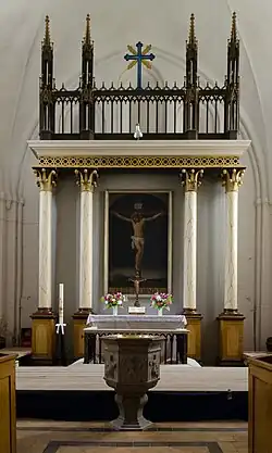 Der Altar sowie die gesamte Ausstattung stammt aus den Jahren 1828 und 1829. Während dieser Zeit erfolgte eine umfassende Renovierung. An der Nordwand des Altarraumes ist eine Triumphkreuzgruppe angebracht. Der Christuscorpus ist gotisch und entstand um das Jahr 1300. Die beiden Assistenzfiguren, Maria und Johannes sind jünger und wurden durch einen Restaurator auf die Epoche des Barock datiert.