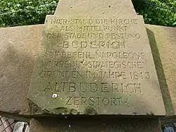 Am 6. Dezember 1813 befahl Napoleon, die gesamte Stadt Büderich dem Erdboden gleichzumachen, da sie – angeblich – bei der Verteidigung der Festung Wesel im Weg sei. Am 19. Dezember, dem 4. Adventssonntag, fand der letzte Gottesdienst in der alten Kirche statt. Pfarrer Arnold Rechtmann ließ die Kirche eilends ausräumen, darunter drei Altäre, die Kanzel und die Orgel.[1] Um Weihnachten 1813 wurde die Kirche vollständig zerstört. An sie erinnert ein am 3. April 1957 errichteter Gedenkstein.[2]