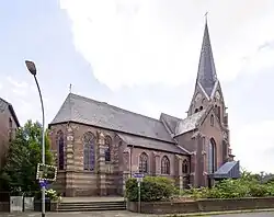 Die gotischen kleine dreischiffige Pseudobasilika mit einem einjochigen Chor mit 5/8 Schluss wurde 1487 aus Backstein mit Tuffbändern errichtet. Der vorgesetzte Westturm der Kirche wurde 1899 nach Plänen von Carl Rüdell und Richard Odenthal durch ein Westquerschiff mit steil aufragendem Turm im Stil der Neugotik ersetzt. Im Innenraum ruhen Kreuzrippengewölbe auf Rundpfeilern. Der westliche Anbau ist in Formen und Material dem Altbau angepasst. Durch Bomben und Beschuss wurde das Gebäude 1945 stark beschädigt. Die Schäden wurden bis 1954 behoben. Die Farbfassung wurde 1981 erneuert.[1]
