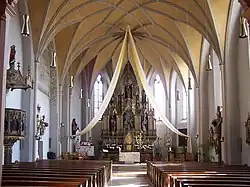 Wesentliche Bestandteile der Kirchenausstattung – der Hochaltar, die inzwischen entfernten Seitenaltäre und die Kanzel – sind im neugotischen Stil ausgeführt und wurden im Jahr 1887 vom Atelier für kirchliche Kunst W. Stoiber aus Landau an der Isar gefertigt.[2]