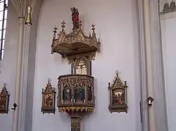Die neugotische Kanzel besitzt einen polygonalen Kanzelkorb, der fünf Halbreliefs geschmückt wird: An der Stirnseite – der Gemeinde zugewandt – hält der Heiland ein offenes Buch mit den beiden griechischen Buchstaben Alpha und Omega. Diese Darstellung wird flankiert von den vier Evangelisten mit ihren Attributen. Auf dem ebenfalls polygonalen Schalldeckel steht der Gute Hirte.[2]