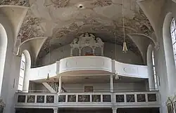 Den westlichen Abschluss des Langhauses bildet eine Doppelempore, auf deren oberem Geschoss die Orgel eingebaut ist. Dieses besitzt eine ausgebauchte Brüstung, die mit runden und ovalen Blendfeldern verziert ist. An der Brüstung der unteren Empore sind Jesus und die zwölf Apostel dargestellt.