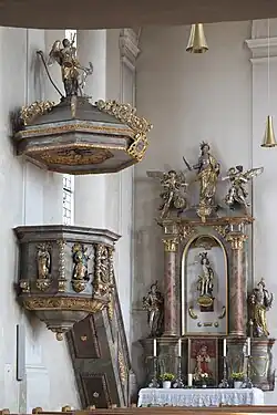 Die barocke Kanzel entstand um 1700. Am Kanzelkorb stehen zwischen gewundenen Säulchen in von Muschelschalen bekrönten Nischen die Schnitzfiguren Christi und der vier Evangelisten mit ihren Attributen. Der Schalldeckel wird von einem Posaunenengel bekrönt.[2]