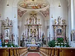 Der großzügige Kirchenraum besteht aus einem vierachsigen Langhaus und einem eingezogenen, gerade geschlossenen Chor. Dieser besitzt leicht konvex geschweifte Seitenmauern und ausgerundete Ecken, in die Rundnischen mit Heiligenfiguren aus der Bauzeit der Kirche eingeschnitten sind. Der Chor wird von einer Flachkuppel über vier Stichkappen, die auf gekuppelten Pilastern aufliegen, überwölbt. Das Langhaus wird durch Pilaster mit profilierten Kapitellen gegliedert und ist mit einem flachen Tonnengewölbe mit Stichkappen gedeckt.[2]
