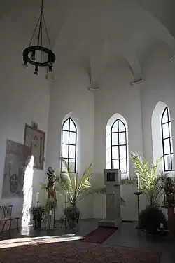 An der nördlichen Chorwand sind Fresken aus dem 16. Jahrhundert erhalten. Auf einer Szene ist die Kreuzigung Christi mit Maria, die unter dem Kreuz steht, dargestellt. Auf weiteren Szenen sieht man Heilige und Weihekreuze mit der Hand Gottes.