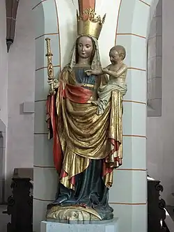Vor dem Nordportal steht die Kopie einer frühgotischen Steinmadonna, deren Original aus der Erbauerzeit der Kirche stammt (ca. 1400).