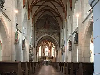 Die Seitenschiffe sind durch Spitzbogenarkaden vom Mittelschiff getrennt, wobei in halber Höhe eine Empore eingezogen ist. Ein Kreuzrippengewölbe schließt den Innenraum nach oben ab. Auffällig ist der vergleichsweise niedrige Ostteil, wodurch sich an der östlichen Wand über dem Triumphbogen eine große Wandfläche ergibt, die als Grundfläche für das Gemälde zum Jüngsten Gericht genutzt wurde.