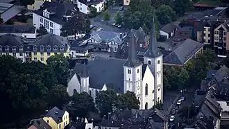 Das außen verputzte dreischiffige Gebäude hat die Grundform einer Emporenbasilika mit Querhaus. Allerdings ist der gesamte Bau von einem großen Satteldach gedeckt (seit dem 16. Jahrhundert). Eine Besonderheit sind die unterschiedlich breiten Seitenschiffe, die auch dem äußeren Bau eine Asymmetrie verleihen. Der Baustil ist von der späten Romanik und der frühen Gotik geprägt. Bemerkenswert sind die Türme, von denen es insgesamt vier gibt. Die zwei Westtürme tragen die Glocken und bilden zusammen mit dem Giebel des Langhauses eine beeindruckende Fassade, wohl einzigartig im Gebiet des Westerwalds. Außerdem besitzt das Bauwerk noch zwei kleinere seitliche Türme, einen Nord- und einen Südturm. Die Türme sind durch Lisenen und Blendarkaden verziert und tragen spitze, schiefergedeckte Helme.