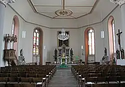 Die heutige Ausstattung geht in großen Teilen auf die Totalrenovierung im Jahr 1884 zurück. Dazu gehören drei Altare aus carrarischem Marmor, die von Architekt Jacquemin (Metz), entworfen wurden. Die Statuen auf den Altären und die beiden Reliefbilder, die den Tabernakel im Hochaltar flankieren wurden von Georg Wagner (Trier) geschaffen, der auch für den Kreuzweg verantwortlich zeichnete. Bei der Renovierung im Jahr 1954 wurden einige Aufbauten von den Altären entfernt. Die drei Gemälde, eines über dem Hochaltar und zwei an den Seitenwänden des Langhauses, stammen aus der Abtei Wadgassen und wurden 1954, nach Entdeckung in einer Remise, restauriert und in der Kirche angebracht. Im Eingang der Kirche befindet sich eine Statue des heiligen Sebastian, die Anfang des 19. Jahrhunderts entstanden sein könnte.[3]