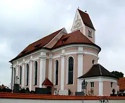 Die geostete Kirche mit einem runden Chorschluss steht an der Hauptstraße. Das Langhaus ist ein Saalbau mit vier Fensterachsen. Sowohl das Langhaus als auch der Chor tragen ein Tonnengewölbe mit Stichkappen. Der Westgiebel ist durch Gesimse und Lisenen gegliedert. Der Kirchturm mit Satteldach befindet sich im nördlichen Chorwinkel. Er überragt das Kirchendach des Langhauses nur wenig. Die östlich am Chor angebaute Sakristei ist ein niedriger Bau mit einer Flachdecke. Der Aufgang zur Kanzel befindet sich an der Nordseite.[2]