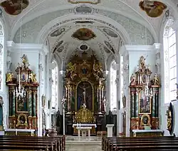 Drei Deckengemälde in kleinen Spiegeln von Johann Friedrich Sichelbein und stellen die Schlüsselübergabe an Petrus, die Himmelfahrt Mariäund die Bekehrung des Paulus dar. Der Stuck im Innenraum besteht aus Ranken, Bandelwerk, Engelsköpfen und Blattwerk.[2]
