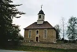 Das Kirchenschiff mit Flachdecke und aufgesattelten hohem Dachreiter hat eine Barockhaube. Im Altarraum befindet sich ein abgetrennter kleiner Raum als Gemeindestube.