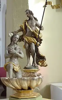 • Die Skulpturengruppe mit der Darstellung der Taufe Jesu auf dem Deckel des Taufbeckens ist ein Werk aus der zweiten Hälfte des 18. Jahrhunderts.