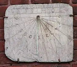 Eine beim heutigen Bushof wiedergefundene Sonnenuhr von 1658 wurde an der Südaußenseite angebracht. Es handelt sich um eine nach Süden berechnete und ausgerichtete vertikale Wandsonnenuhr, die auf einer ebenen Schieferplatte ausgeführt ist. Die Skala zeigt Strahlen in der Zählung 6-12-6. Angezeigt wird die wahre Ortszeit (WOZ). Die unvollständige Inschrift ist Latein und lautet „VITA FVGIT VT VMBR …“ (= Das Leben flüchtet wie ein Schatten).
