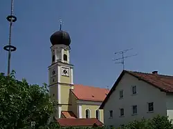Die barocke Saalkirche wurde in den Jahren 1715 bis 1718 erbaut. Sie besteht aus dem Langhaus, dem eingezogenen, dreiseitig geschlossenen Chor im Südosten, einer Sakristei an der Nordostwand des Chors und dem Kirchturm auf quadratischem Grundriss im Nordwesten. Sein oberstes quadratisches Geschoss enthält die Turmuhr, darüber befindet sich ein achteckiges, mit einer Zwiebelhaube abschließendes Geschoss.