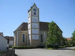 Unter teilweiser Verwendung der Mauern des Vorgängerbaus, einer frühgotischen Chorturmkirche, wurde die heutige Kirche von Pfarrer Maximilian Hegenauer „mit eigenen Mitteln“ – so eine lateinische Inschrift an der Kirche – und mit Unterstützung der Dorfbewohner 1750 bis 1755 neu errichtet. Eine eventuelle Beteiligung des Klosters Kaisheim ist aufgrund fehlender Quellen nicht eruierbar. Nach einer mehrjährigen Phase der Ausstattung erfolgte am 30. August 1781 die Einweihung. Das 19. Jahrhundert veränderte vor allem das Aussehen Kirchturmdaches. Das 20. Jahrhundert brachte mehrere Außen- und Innenrestaurierungen. Die Glocken wurden im Laufe der Zeit mehrmals durch neue ersetzt; die heutigen stammen von 1950.[3] Die jüngste Außenrenovierung einschließlich des Turms erfolgte 2016.
