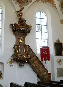 - Die Kanzel (um 1790) ist ockerrot marmoriert und silber-gold-dekoriert. Am unteren Rand des polygonen Korpus sitzen Putten mit Symbolen der christlichen Tugenden, an der Rückwand befindet sich eine Christusfigur. Am Schalldeckel zeigen sich die Symbole der vier Evangelisten, den Abschluss bildet ein posaunender Engel.[9]