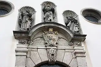 Über der Portalverdachung stehen die Skulpturen der beiden Kirchenpatrone, die Apostel Petrus und Paulus, und in der Mitte Christus als Erlöser. Das Portal des südlichen Langhauses wird von einer Marienfigur bekrönt.