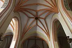 Die Gurtbögen der Sterngewölbe ruhen auf zwölf massiven Pfeilern, ein riesiges rotes Ziegeldach bedeckt die drei Schiffe: das Haupt- und zwei Seitenschiffe, die im Osten mit Apsiden abgeschlossen sind.