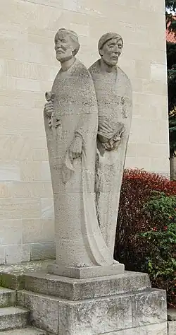 Die 1957 bis 1962 erbaute Kirche zeigt in der Hauptfassade einen mächtigen Westriegel mit einem Rosettenfenster und zwei Kirchtürmen. Im Erdgeschoss der Türme befindet sich eine Empfangshalle. Südlich des Haupteingangs steht eine Skulpturengruppe aus zwei Figuren, die Apostel Peter und Paul darstellend.