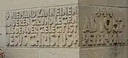 An der südwestlichen Ecke der Kirche ist der Grundstein eingearbeitet, der folgende Inschriften trägt: Niemand kann einen anderen Grund legen als den der gelegt ist / Jesus Christus. / AD 1957 Peter + Paul.