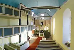Das Langhaus und der Chor sind mit einem steilen, ziegelgedeckten Krüppelwalmdach bedeckt. Das Dach des Langhauses ist auf der Nord- und Südseite mit jeweils zwei Dachgauben versehen. Im 17. Jahrhundert wurden die Außenmauern erhöht, eine doppelstöckige Empore eingebaut, aufgrund der geringen Breite nur an der Nord- und der Westwand, und an der Nordseite Vorbauten für die beiden Portale geschaffen, das Hauptportal und ein Portal, das zu den Emporen und in die Winterkirche führt. Laut einem im Turmknauf gefundenen Dokument wurde nach einem Blitzeinschlag im Jahr 1738 das Kirchenschiff mit einem hölzernen Tonnengewölbe überspannt, das hohe kreuzgratgewölbte Erdgeschoss des Turmes durch einen hohen Spitzbogen zum Saal geöffnet. Ab 1987 erfolgte eine Renovierung des Außenbaus und des Innenraums. Hierbei wurden auch Wandmalereien an der Nord-, Ost- und Südwand des Chors teilweise freigelegt.