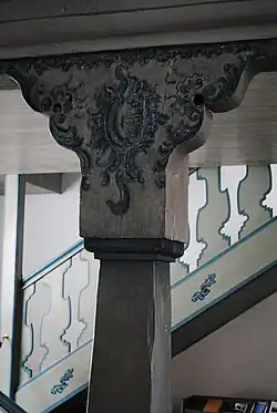 Das Langhaus der Kirche wird von zweigeschossigen Emporen an den westlichen und nördlichen Langhausseiten beherrscht. Sie ruhen auf kunstvoll verzierten Holzpfeilern und sind zum Teil offen, zum Teil in drei Logen durch Glas- bzw. Rankengitterfenster abgeschlossen. Die mittlere wird Herrschaftsloge oder Herrschaftsstand genannt, ist mit Akanthuswerk und kleinen Pilastern verziert und war den Mitgliedern des Fürstenhauses vorbehalten.[9] Ein großes Wappen des Hauses Castell bekrönt diese Empore. Die Emporen wurden von Matthias Fiedler geschaffen. Er erhielt für die Arbeit 70 Gulden. Die Verzierungen stammen wohl von den Meistern des Altars.