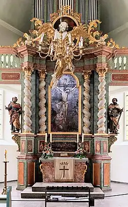Der von Simon Merzer geschaffene Altar mit den Maßen „26 Schuh in die Höhe und 12 Schuh in die Breite“ steht mittig im Chor. Der Aufbau ist mehrfach gegliedert und hat vier konkav-konvex gewundene Säulen, die mit geschnitzten vergoldeten Bändern verziert sind. Das Altarblatt zeigt Christus als Gekreuzigten. Links neben dem Kreuz kniet die trauernde Maria Magdalena. Unterhalb des Altarauszugs ist ein Ehewappen des Erbauers Johann Friedrich von Castell und seiner dritten Ehefrau, der Gräfin Catharina Hedwig von Rantzau-Breitenburg, zu sehen. Auf dem Auszug stehen links und rechts zwei Vasen. Ein ovales Ölgemälde in der Mitte des Altarauszuges zeigt den auferstandenen Christus vor dem leeren Grab. Am Sockel des Altars befindet sich ein weiteres, kleineres Ölbild mit der Abendmahlsszene. Als Künstler der Bilder kommt der Würzburger Hofmaler Oswald Onghers in Betracht. Zwei Figuren der Kirchenpatrone St. Peter und Paul aus dem Jahr 1650 flankieren den Altar im Mittelteil.[5]