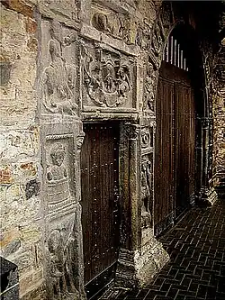 In seiner ursprünglichen Bauform bietet sich dem Betrachter wohl allein der Torbogen mit seinen Steinreliefs dar, da dieser Bauteil wegen der besonderen Ausgestaltung seiner einzelnen Steine von Anfang an nur zu einem Bogen zusammengefügt werden konnte. Dieser Torbogen trägt zehn Steinreliefs, an deren Deutung sich Theologen und Kirchenhistoriker seit dem 19. Jahrhundert versuchten. Herrschende Interpretationslinie ist nach wie vor die These des Bonner Ordinarius’ Albert Michael Koeniger aus dem Jahr 1947, der in den Symbolen die Darstellung der Todsünden gemäß dem Beichtspiegel des Bischofs Burchard von Worms erkannt haben will. Nach dieser Lesart, die noch acht statt der heute geltenden sieben Todsünden kannte, bedeuten die Reliefs von links nach rechts: