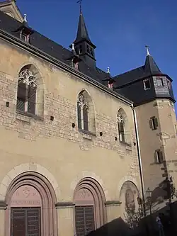 Das dreijochige alte Kirchenschiff im romanisch-gotischen Übergangsstil weist im Sockelgeschoss Rundbogenarkaden, in den Obergaden gotische Maßwerkfenster auf. Ein Satteldach hat Gauben und einen Dachreiter. Der Chor schließt mit 5/8.