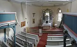 - Kanzelaltar von 1737 mit Gehängen von Trauben und Rosen, geschaffen von dem Bildhauer Andreas Bessert aus Groß-Rettbach