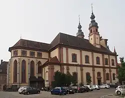 St. Peter und Paul ist eine gewölbte Freipfeiler-Emporenhalle. Der gotische Chor ist im Obergeschoss barock verändert. Die romanischen Türme kamen beim Neubau innerhalb des Kirchsaals hinter der Fassade zu stehen. Sie wurden außen barock überformt. Die dreigeschossige Fassade folgt dem Schema des römischen Barock, zeigt aber auch noch Renaissanceelemente. Sie enthält zahlreiche Heiligenstatuen, die 1773 durch die Werkstatt Wagner geschaffen wurden. Der Mittelrisalit ist konvex vorgewölbt. Über dem Portal befinden sind die Wappen der Fürstbischöfe von Greiffenclau und von Schönborn angebracht, 1956/57 wiederhergestellt von Georg Schneider. Eine Statue des heiligen Aquilin rechts des Haupteingangs wurde 1977 von Wolfgang Finger restauriert.