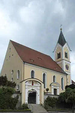 Die Kirche wurde zwischen 1686 und 1694 vom Wessobrunner Barockbaumeister Johann Schmuzer errichtet. Chor und Empore entstanden in der Mitte des 18. Jahrhunderts. Der Turm erhielt seine heutige Form bei einer Erneuerung im Jahr 1847. Namhafte Handwerker und Künstler aus der Region Mittelschwaben waren bis in die heutige Zeit an der Ausgestaltung der Kirche beteiligt.