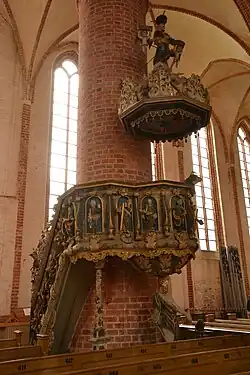 Die hölzerne Kanzel von 1710 ist mit Akanthusschnitzereien verziert. Der Korb wird von einer geschnitzten Figur Johannes des Täufers getragen; die Treppenbrüstung ist mit Figuren der zwölf Apostel in rundbogigen Nischen bereichert. Der kronenartige Schalldeckel mit Christus als Weltenrichter ergänzt die Ausstattung. Bemerkenswert ist die illusionistische Darstellung der mit Spruchbändern umherfliegenden Engel. Weiter ist ein Sandstein-Epitaph des 1617 gestorbenen Bürgermeisters J. Gratz und seiner Frau, dargestellt in Zeittracht als Flachrelief, zu erwähnen.