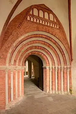 Das Portal, 1220 geschaffen, erzielt seine beeindruckende Wirkung mit einer seltenen Materialverwendung, ausgeführt als Backstein-Stufenportal mit eingestellten Sandstein-Gewändesäulen. Jedes Kapitell hat je nach Stein und Bearbeitung sein eigenes Aussehen. Die Kapitelle, die mit einer durchgehend profilierten Kämpfer-Zone abschließen, bilden so den Rahmen für den Pflanzenschmuck aus Sandstein. In den Archivolten ist der Materialwechsel mit verzierten Backstein-Rundbögen und Sandstein-Wulstbögen weitergeführt. Das Portal ist als Bedeutungsträger Bild für den Eingang zum Paradies, der Zugang in die Kirche als „Stadt Gottes“ in das „Himmlische Jerusalem“.
