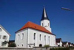 Die Saalkirche wurde 1736 auf Veranlassung eines von Wolfstein erbaut. An den quadratischen, gotischen Chorturm wurde nach Westen ein Langhaus angebaut, dessen Wände mit Bogenfenstern ausgestattet sind. Der Chorturm wurde 1966 mit einem achteckigen Geschoss zur Unterbringung des Glockenstuhls, in dem vier Kirchenglocken aufgehängt wurden[1], aufgestockt und mit einem schiefergedeckten Knickhelm bedeckt.