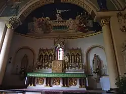 Vom Mittelgang aus führt eine Stufe zu den Kommunionbänken. Vor der Apsis erhebt sich ein von Säulen eingerahmter Baldachin. Der Bogen der Apsis trägt über einer Darstellung der Anbetung des apokalyptischen Lamms die Inschrift „Dignus est Agnus qui occisus est [accipere virtutem, et divinitatem, et sapientiam, et fortitudinem, et honorem]“ (‚Würdig ist das Lamm, das geschlachtet ist [Macht zu empfangen, Reichtum und Weisheit, Kraft und Ehre, Lob und Herrlichkeit]‘), aus Offenbarung 5,12 .